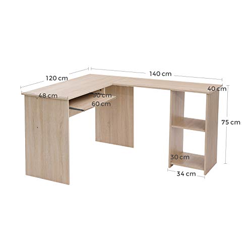 VASAGLE Scrivania a Forma di L, Tavolo ad Angolo con 2 Ripiani Portaoggetti, Vassoio Tastiera, per Studio, Ufficio, 140 x 120 x 75 cm, Colore Rovere