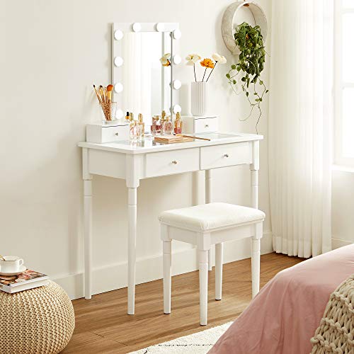 VASAGLE Tavolo da Trucco con Sgabello Imbottito, Toeletta con 10 Luci Dimmerabili, 2 Cassetti in Vetro Temperato Trasparente, 2 Portaoggetti Piccoli, Postazione Trucco, Idea Regalo, Bianco RDT172W01
