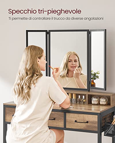 VASAGLE Tavolo da Trucco con Sgabello Imbottito, Toeletta con Specchio Tri-pieghevole, 3 Cassetti, Porta Asciugacapelli, Postazione Trucco, Stile Industriale, Marrone Rovere e Nero RVT004B50