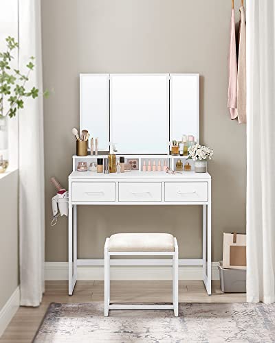 VASAGLE Tavolo da trucco con sgabello imbottito, toletta con specchio triplo, 3 cassetti, porta asciugacapelli, cosmetico, stile moderno, bianco RVT004W14