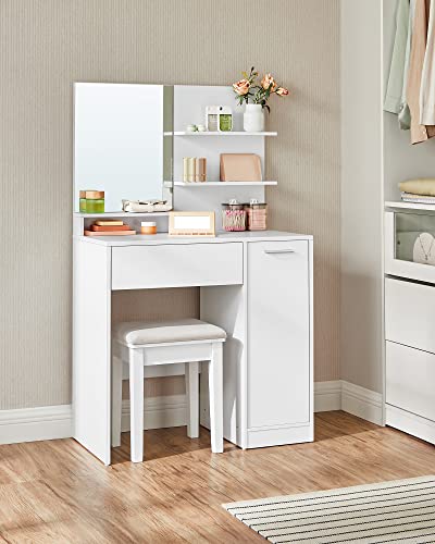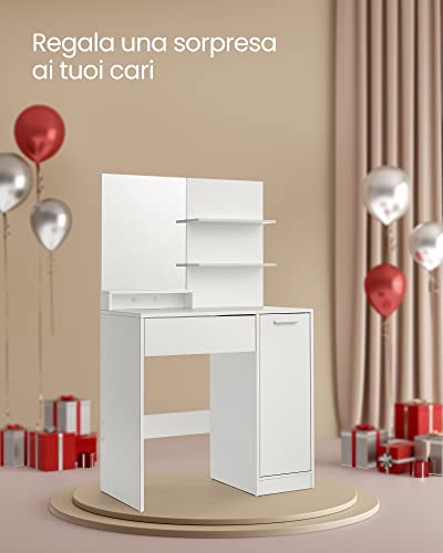 VASAGLE Toeletta, Tavolo da Trucco con Specchio Grande, Scomparto con 2 Ripiani Regolabili, 1 Cassetto, 2 Mensole, Postazione Trucco Moderna, Bianco RDT119W01
