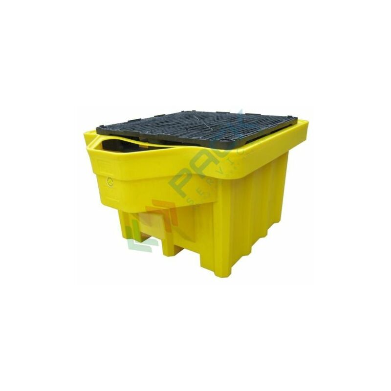 Vasca di sicurezza per lo stoccaggio di 1 cisterna da 1000 Lt realizzata in polietilene (PE) atossico stabilizzato U.V. di colore giallo, roto-stampato, monolitico ovvero stampato in unico pezzo senza giunzioni. Vasca di contenimento dotata di una sporgenza al cui interno è possibile posizionare un secchio, Mis. 1650 L x 1350 P x 970 H mm, capacità 1100 Lt, portata statica massima 1500 Kg (con carico uniformemente distribuito). Vasca di sicurezza con struttura auto portante e rinforzata per resistere agli urti, resistente agli agenti chimici e dotata di una griglia in polipropilene asportabile per una facile pulizia. Sormontabile a vuoto, pallettizzata per un' agevole movimentazione da vuoto con transpallet o carrello elevatore.
