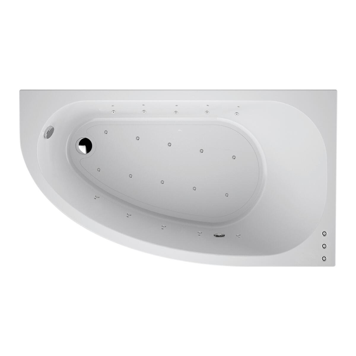 In acrilico bianco, forma asimmetrica, angolare destra, installazione a parete o nicchia. Idromassaggio airpool, whirpool 10 + 6 bocchette, cromoterapia 6 leds rgb (8 colori)