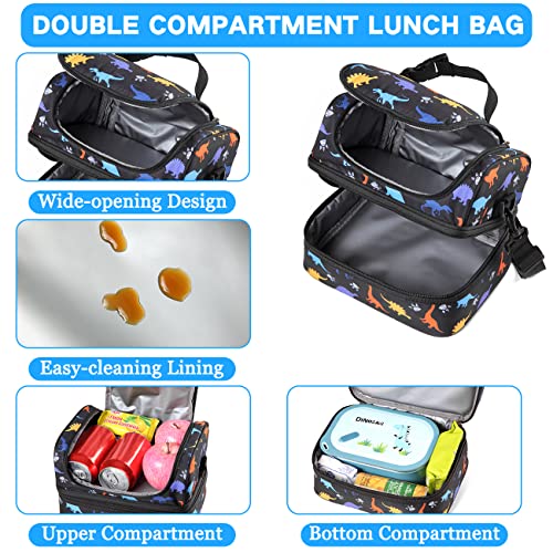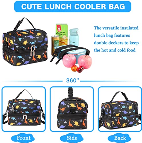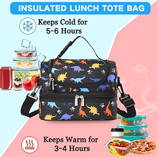 VASCHY Borsa termica per bambini, borsa da pranzo portatile con scomparti separati, riutilizzabile per ragazzi, borsa da pranzo con tracolla regolabile per scuola e picnic (Dinosauro nero)