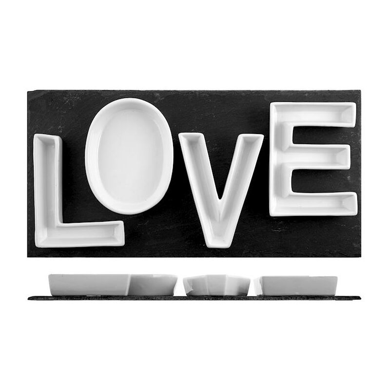 Vassoio rettangolare in ardesia con 4 coppette in porcellana bianca love cm 40x20. E' possibile lavare in lavastoviglie le coppette e sono adatte al forno microonde