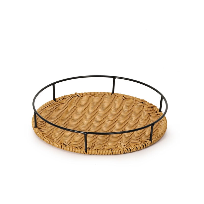 Rotondo Dimensioni Del Vassoio: Diametro 10.63in/27cm, Altezza 1.97in/5 centimetri.Vassoio da portata in tessuto: questo vassoio da portata rotondo intrecciato viene fornito con il materiale in rattan e la maniglia della struttura in metallo, facile da trasportare, può essere posizionato ovunque in casa.Comoda maniglia: la maniglia circolare rende facile da trasportare dalla stanza alla stanza per servire, picnic, matrimoni o altre occasioni.Multifunzionale: questo vassoio da portata è perfetto per servire dessert, formaggio o cupcakes, e può anche mantenere gli oggetti e l'arredamento ordinati sul tavolino. Un posizionamento ben organizzato per la tua casa.Facile da pulire: basta pulire con un panno umido, quindi tenere in asciutto. Rattan Vassoio con ManicoCaratteristiche del prodotto:Vassoio da portata rotondo intrecciato, bello ed elegante;