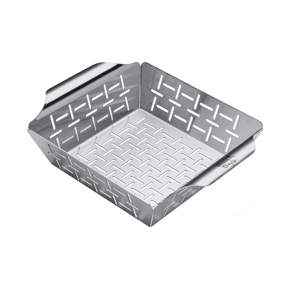 In acciaio inox cm 24 x 19. ideale per la cottura di verdure. La forma robusta e i manici consentono di spostarlo facilmente dal barbecue alla tavola.