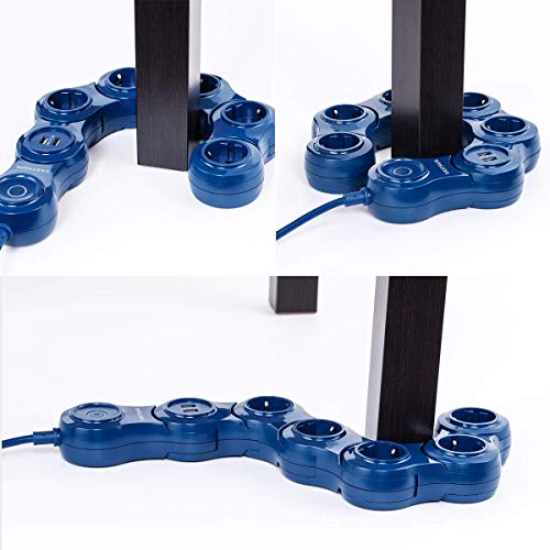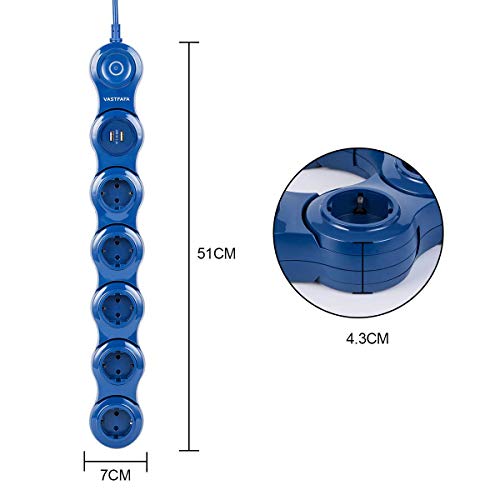 VASTFAFA Ciabatta di Protezione Contro Le sovratensioni con 2 Porte USB a 5 uscite con Interruttore di Sicurezza,Stazione di Ricarica ad Ampia Distanza per casa e Ufficio e Viaggi,(Cavo 1,5 m,Blu)