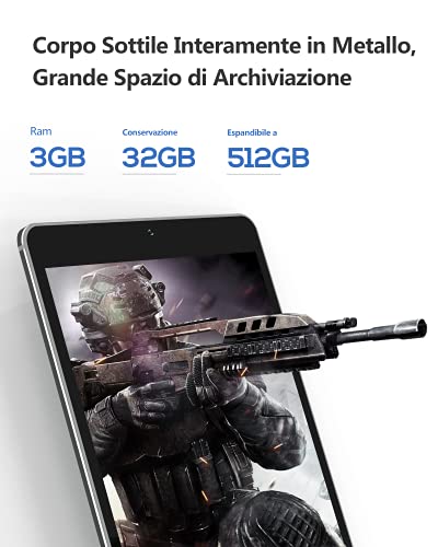 [Corpo Sottile, Grande Spazio di Archiviazione]: porta sempre con te questo tablet dal design sottile, elegante e completamente in metallo di alta qualità. I 32 GB di spazio di archiviazione e lo slot per la scheda micro SD si possono incrementare facilmente fino a 512 GB. Così potrai scaricare tutti i tuoi eBook preferiti, le canzoni, i video, le foto, la musica e tanto altro