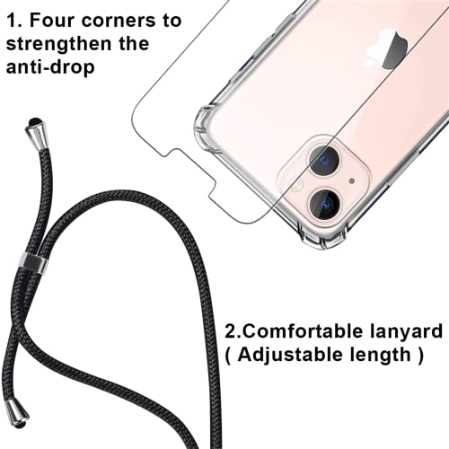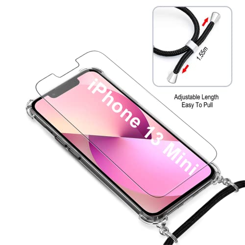 Vauki Custodia con Cordino per iPhone 13 Mini Cover e Vetro Temperato Trasparente con Collana, Antiurto Silicone Case con Laccio Tracolla Cordoncino Custodia per Apple iPhone 13 Mini 5,4", Nero