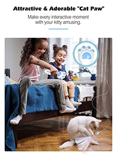 VavoPaw Giocattolo Interattivo con Piume per Gatti, Bastone Ritiro con Un Clic a Forma di Zampino dei Gatti con Pallina Giochi Divertente per Gattini Giochi Gatti da Interni, Bianco&Blu