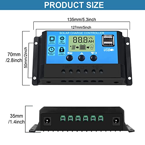 Compatibilità: il controller caricatore solare è automaticamente compatibile con il sistema 12V o 24V, doppia uscita USB 5V/3A, per caricare il tuo telefono, tablet, PC, dimensioni: 133 x 70 x 35 mm, peso: 180g