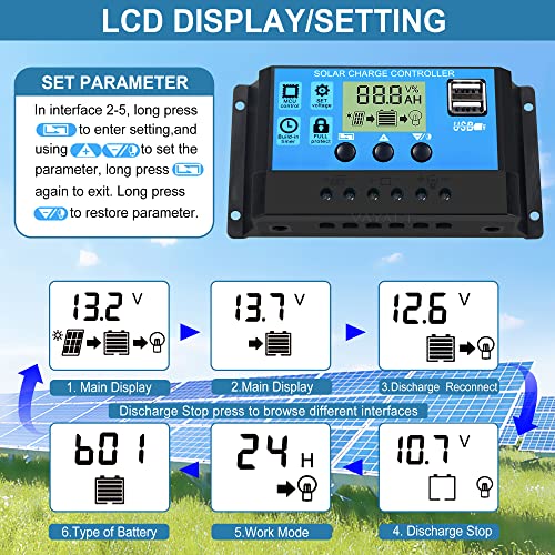 Controller pannello solare: il microcontrollore industriale integrato del controller carica gestisce automaticamente il sistema di lavoro dei pannelli solari e delle batterie, l'impostazione a un tasto, il display digitale, la funzione memoria automatica e i dati non andranno persi quando la batteria è scarica.