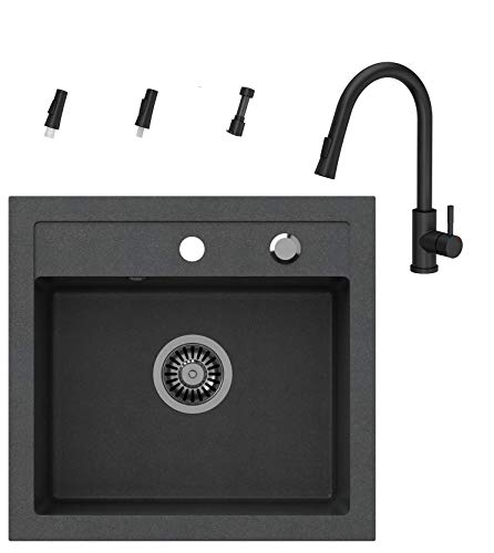 VBChome, lavello e rubinetteria, 50 x 47 cm, da cucina, da incasso, in nero screziato, lavello singolo, complanare, con rubinetto a sifone