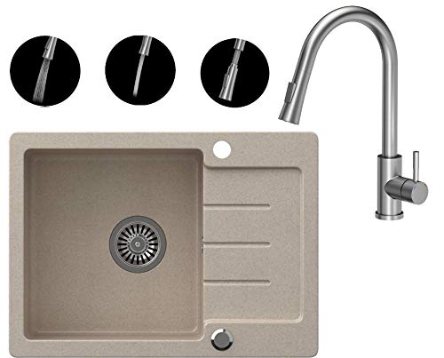 VBChome Lavello singolo da incasso Beige, da 60 x 44 cm, in granito composito puntiforme, reversibile, con sifone