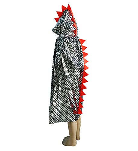 VDSVD Mantello da dinosauro, costume da drago, mantello per Halloween, mantello con cappuccio, mantello da dinosauro, cosplay, per bambini, fantasia e regali (argento), 90 x 110 cm