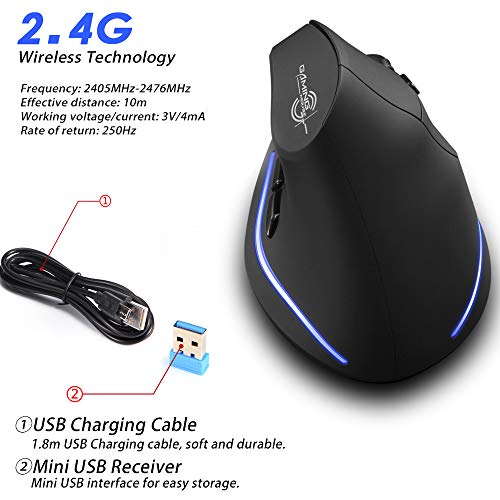 Veeki - Mouse verticale senza fili, per destrorsi, 2,4 GHz, wireless, ergonomico, ricaricabile, con 3 DPI regolabili 1000/1600/2400, 6 pulsanti, compatibile con PC, desktop, Mac (nero)