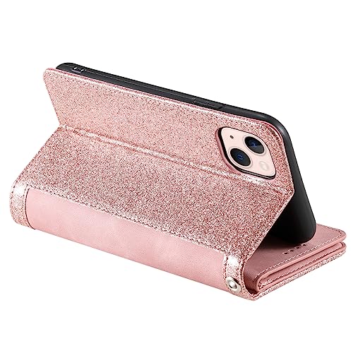 VEEMOS Custodia a libro per iPhone 14, con brillantini, con scomparto per carte di credito, colore: rosa