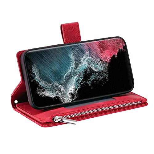 VEEMOS Custodia a libro per Samsung Galaxy S22 Ultra con motivo floreale, con scomparti per carte di credito, colore: rosso