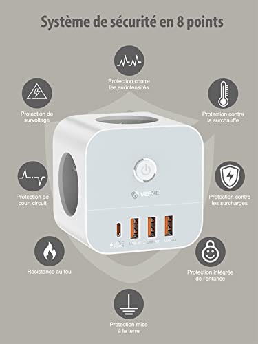 [Presa adattatore 7 in 1: espandi una singola fonte di alimentazione a 7 prese con una multipresa a 3 vie e 4 porte USB (tipo A x 3 e tipo C x 1). Questo cubo per prese cordless è perfetto per cucine o soggiorni dove le prese sono spesso limitate. Ricarica facilmente telefoni cellulari, tablet, computer e asciugacapelli.