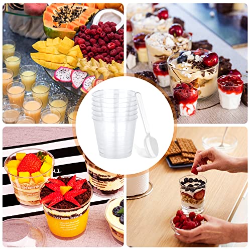 Vegan 50 tazze da dessert - 200 ml in plastica con cucchiaio, mini tazza da dessert, bicchieri da dessert trasparenti riutilizzabili in plastica per dessert, budino, mousse party (rotondi)