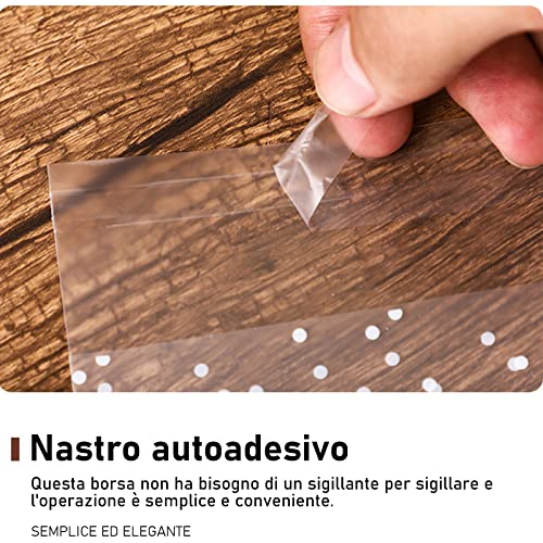 [Uso Versatile]: Bustine trasparenti sono perfetti per biscotti, dolci, cioccolato, noci, snack, gioielli e altri piccoli oggetti. Il motivo a pois bianchi conferisce al sacchetto trasparente per biscotti un aspetto più ornamentale ed è ideale per la confezione regalo.