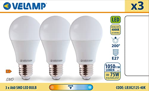 VELAMP Kit da 3 lampadine SMD LED, Goccia A60, 11W/1055lm, base E27, 4000K