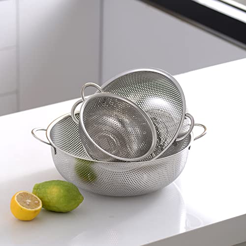Velaze Scolapasta Microforato, Set 3 Pezzi Colino Microforato con Manico Filtro Premium in Acciaio Inox SUS304 per Cibo, Frutta, Verdura, Pasta - 1L, 3L, 5L (16/22/28 cm)