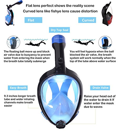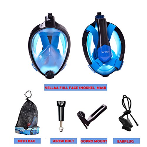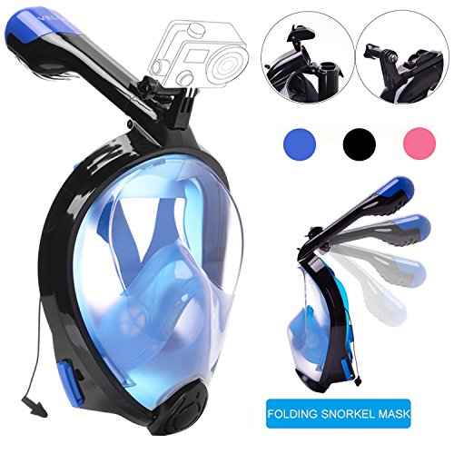 VELLAA Maschera da Snorkeling con 180 gradi Visione Panoramica,Maschera Subacquea Pieno Facciale Antiappannante Antiperdita,Foldable Full Face Snorkel Mask Blu.L/XL