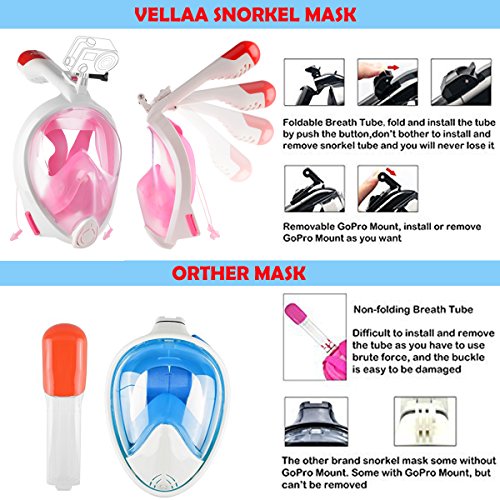 VELLAA Maschera da Snorkeling con 180 Gradi Visione Panoramica,Maschera Subacquea Pieno Facciale Antiappannante Antiperdita,Foldable Full Face Snorkel Mask Rosa.S/M