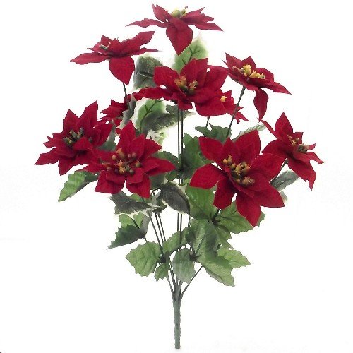 Velvet Poinsettia cespuglio artificiale con 10 teste di fiore accompagnato da Holly fogliame