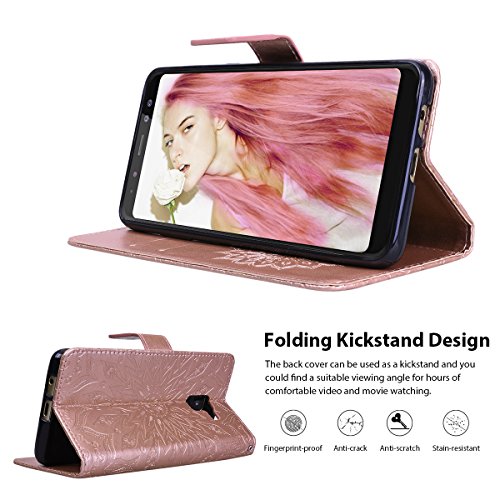 VemMore Cover Samsung Galaxy A8 Plus 2018 Custodia di Pelle Case Flip Portafoglio Retro Libretto Magnetico Protettiva Non Graffi Pelle PU e TPU Silicone Funzione Supporto Fiore Girasole - Oro Rosa