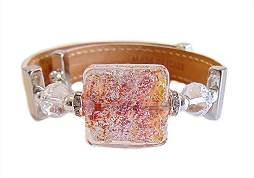 VENEZIA CLASSICA - Bracciale da Donna con perla quadrata in Vetro di Murano Originale e vera pelle Toscana, Collezione Kate, con foglia in oro 24kt o argento, Made in Italy certificato (rosa)