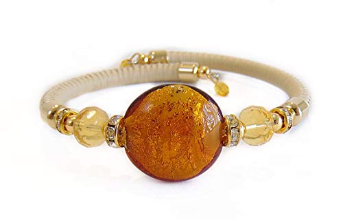 VENEZIA CLASSICA - Bracciale da Donna con Perla in Vetro di Murano Originale e vera pelle Toscana, Collezione Tuscany, con foglia in argento e oro 24kt, Made in Italy certificato (Ambrato)