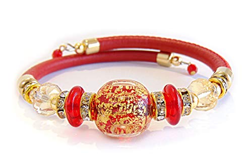 Venezia Classica - Bracciale da Donna con perle in Vetro di Murano Originale e vera pelle Toscana, Collezione Diana, con foglia in oro 24kt, Made in Italy certificato (Rosso)