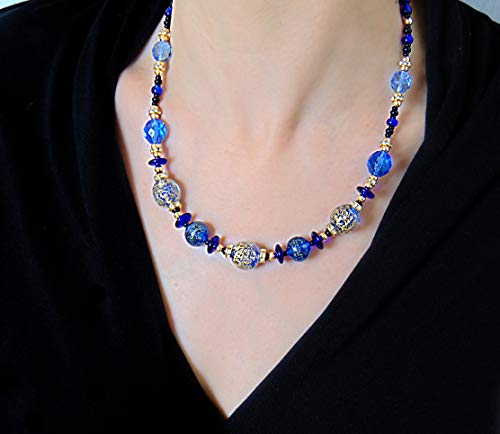 VENEZIA CLASSICA - Collana da Donna girocollo con perle in Vetro di Murano Originale, Collezione Diana, blu con foglia in oro 24kt, Made in Italy certificato
