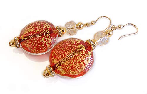 VENEZIA CLASSICA - Orecchini da Donna con perle in Vetro di Murano Originale, Collezione Linde, con foglia in oro 24kt, Made in Italy certificato (Rosso)