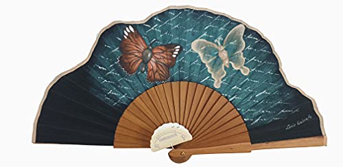 Ventaglio spagnolo realizzato in legno di perale e tessuto di cotone dipinto a mano con farfalle.