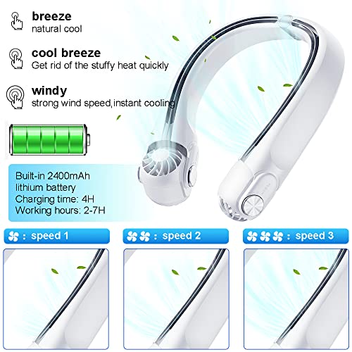 Ventilatore da Collo Portatile, Ventilatore a Collo, Mini Ventilatore Ricaricabile, Ventilatore Collo 360° Flusso D'aria, Ventilatori Cuffie Senza Lama 3 Velocità 2400mAh Ufficio e Viaggio (Bianco)