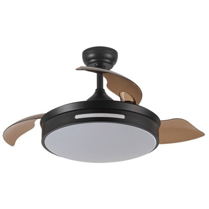 Ventilatore DC serie MICENAS in metallo, ABS e policarbonato, di colore NERO con tre pale DEPLOYABLE ABS molto resistenti. Ha sei velocità regolabili. Tecnologia LED integrata dalla potenza di 72W, con 3 TEMPERATURE LUCE RE