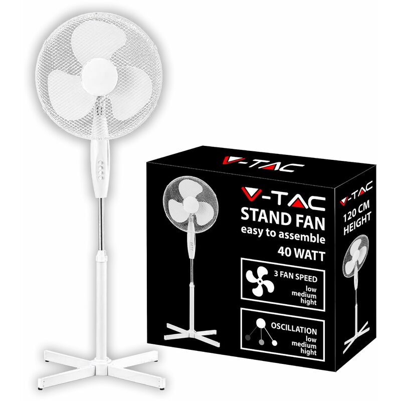 V-TAC Ventilatore a Piantana 40W con Base a Croce - Diametro 60 cm - Altezza Regolabile (Max 120cm) - 3 Pale a 3 Velocità Rotante - Oscillazione e Inclinazione Regolabile - Colore Bianco