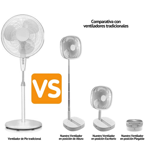 Addio calore allà ovunque tu vada. Sia all'interno della tua casa, cucina, soggiorno, garage, camera da letto o lavoro. La sua altezza è regolabile trasformandolo in un ventilatore senza fili tipo di pavimento, più potente da tavolo, per la scrivania di studio o lavoro.La sua posizione estesa è per godere in spazi aperti ed esterni come terrazze, campeggio e in qualsiasi area esterna.