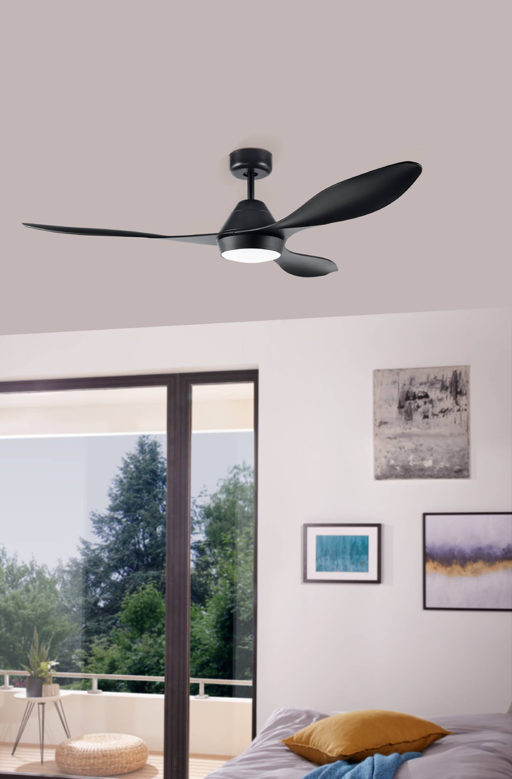 Ventilatore a soffitto Antibes - Materiale metallo nero opaco, diffusore acrilico bianco. Dimensioni: Diametro 132 H 33 cm. Telecomando incluso, timer, 5 velocità, reversibile.