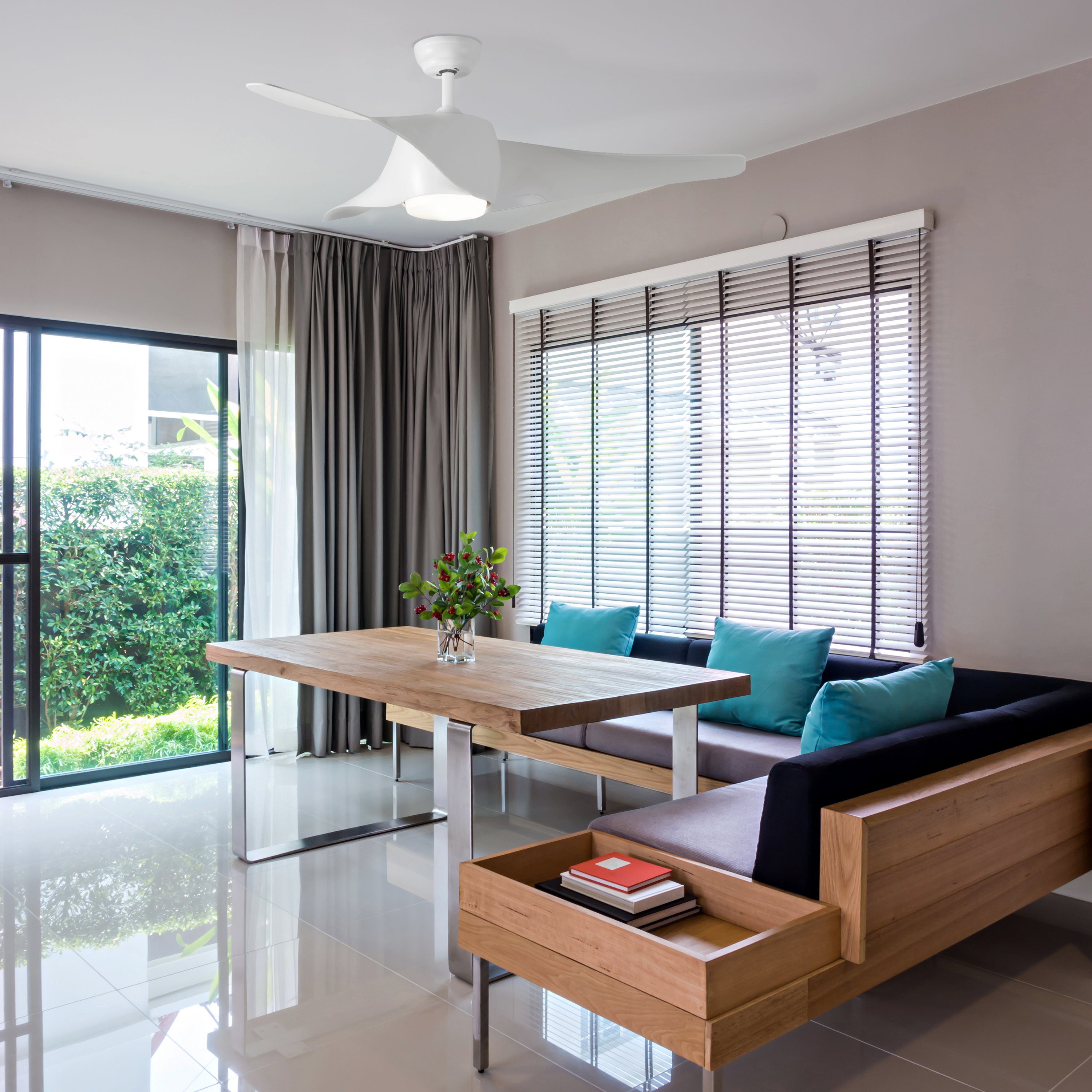 Ventilatore da soffito motore DC da 127 cm, con corpo in metallo e pale in acrilico cieche, che circondano il motore. Con telecomando incluso, che controlla la luce LED dimmerabile nella temperatura del colore. Con diffusore in acrilico. Include due montanti di installazione da 10 e 25 cm.. Motore DC: più silenzioso ed efficiente. Telecomando incluso. Luce a LED