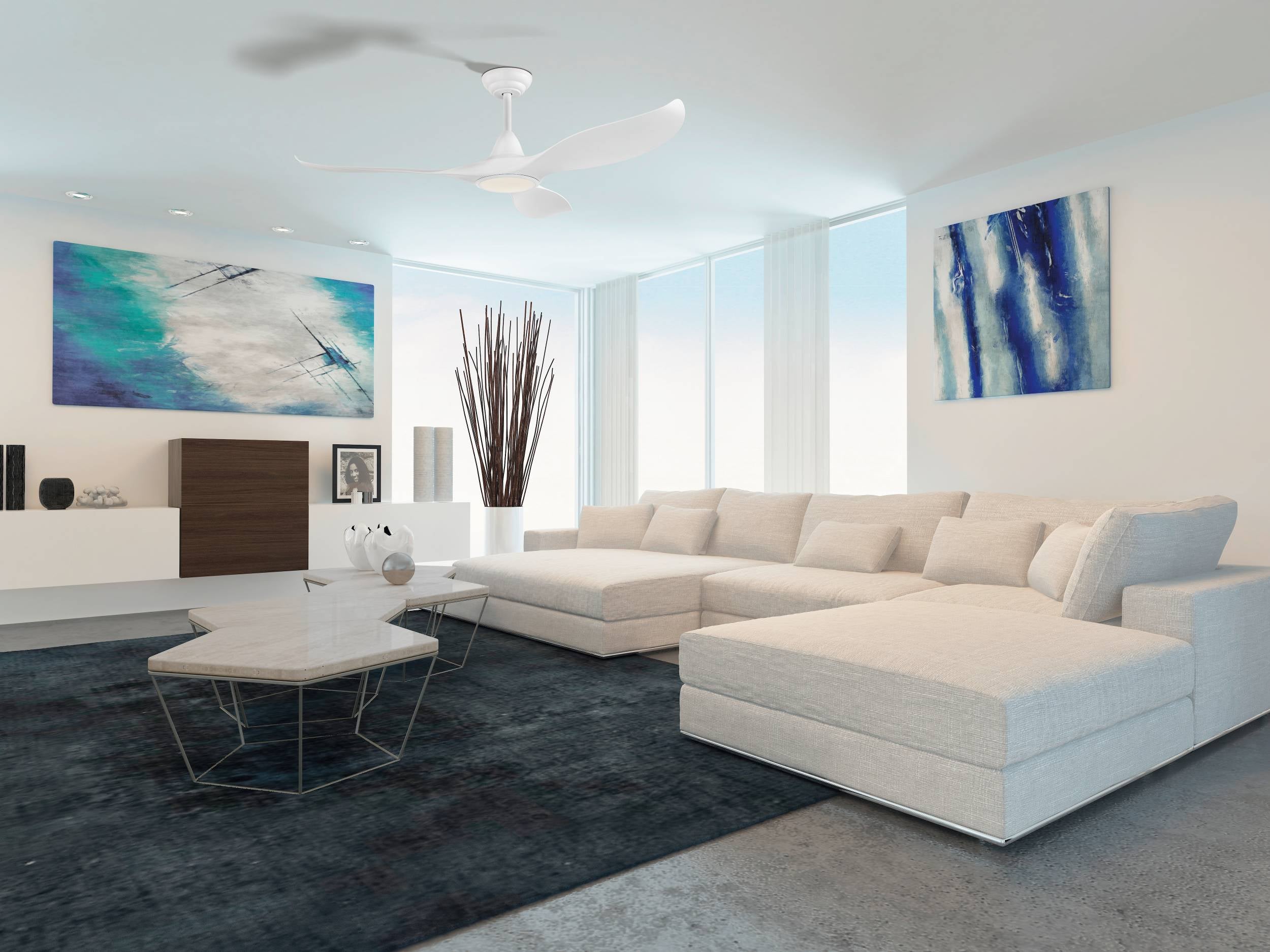 Ventilatore a soffitto Cirali 52 - Materiale ABS bianco opaco, diffusore acrilico bianco. Dimensioni: Diametro 132 H 33,3 cm. Telecomando incluso, timer, 5 velocità, reversibile.