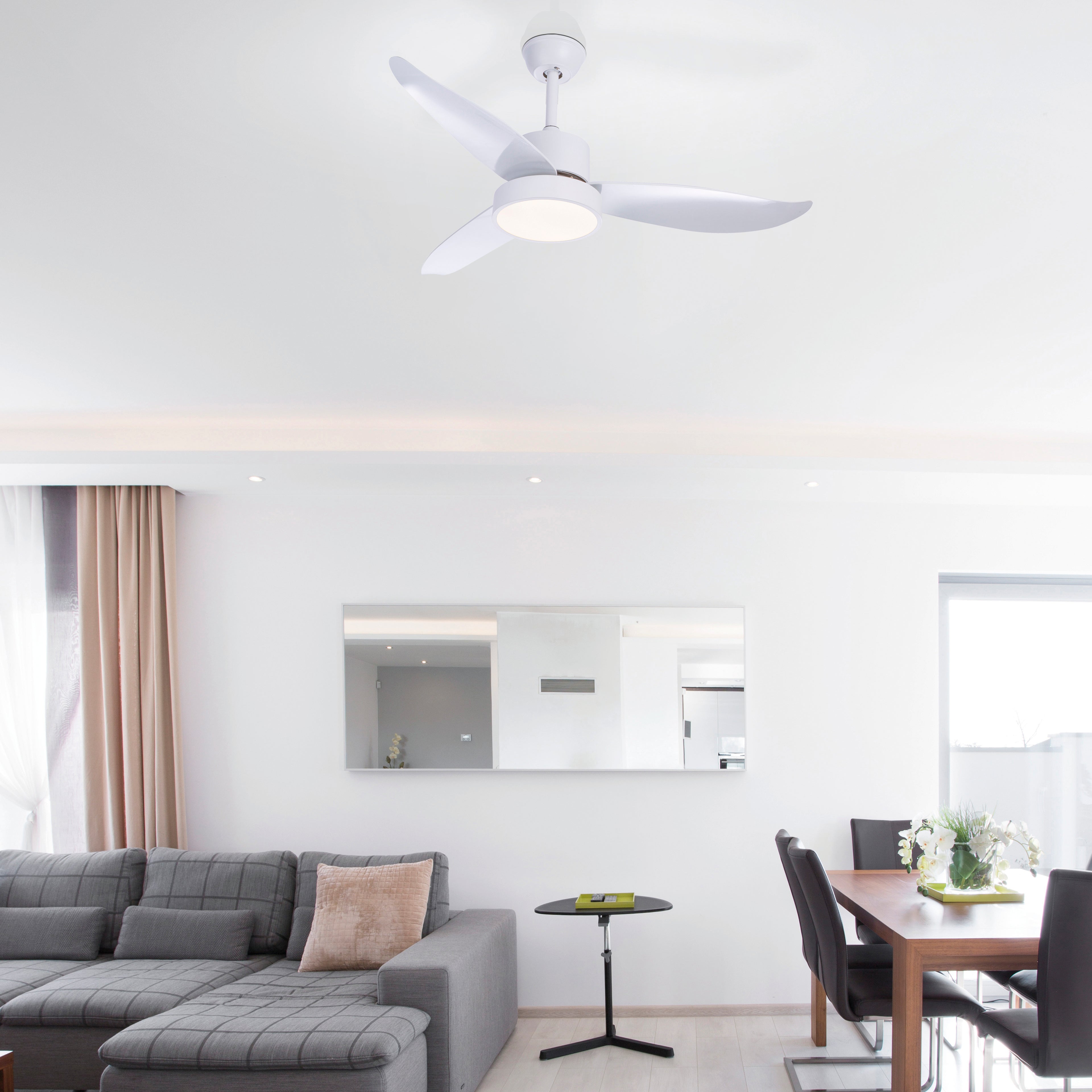 Ventilatore LED integrato con 3 pale reversibili, diametro 114 cm, luce naturale. Ideale per ventilare un ambiente fino a 20 m². Grazie alle pale reversibili puoi distribuire meglio l'aria calda in inverno. Telecomando incluso. Regolabile, a 3 step di velocità