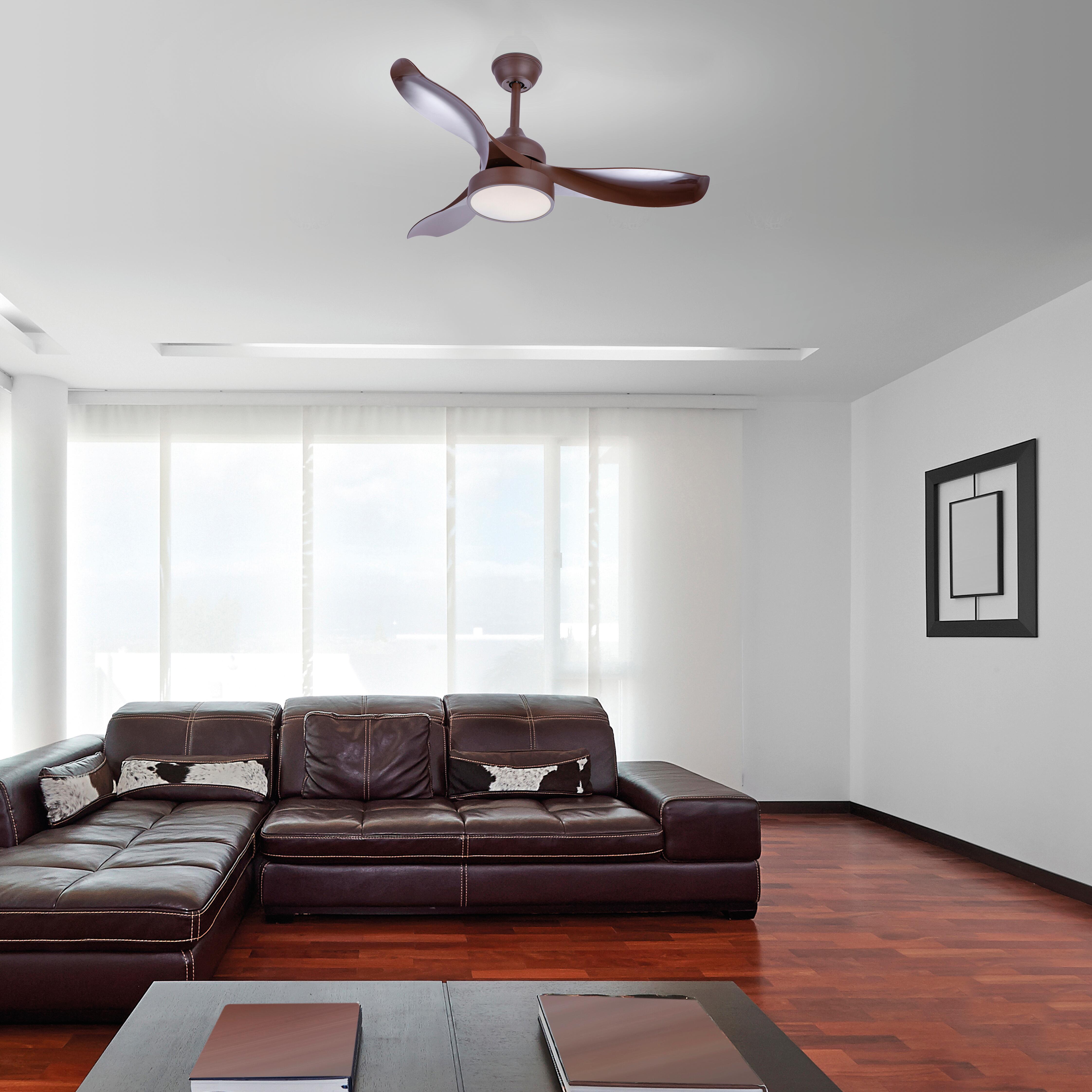Ventilatore LED integrato con 3 pale reversibili, diametro 114 cm, luce naturale. Ideale per ventilare un ambiente fino a 20 m². Grazie alle pale reversibili puoi distribuire meglio l'aria calda in inverno. Telecomando incluso. Regolabile, a 3 step di velocità