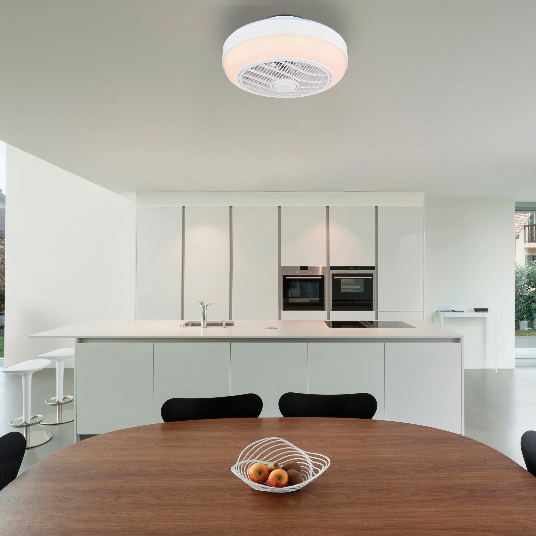 Ventilatore LED integrato con 4 pale a scomparsa e reversibili, diametro 46 cm, luce naturale. Ideale per ventilare un ambiente fino a 20 m². Ideale per avere in un unico oggetto ventilatore e plafoniera. Grazie alle pale a scomparsa, puoi trasformare il ventilatore in una plafoniera. Telecomando incluso. Regolabile, a 3 step di velocità