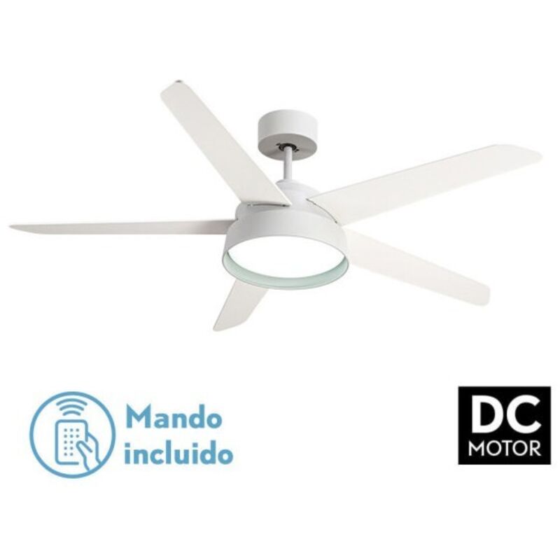 Ventilatore serie LEBECHE in metallo, MDF e vetro, colore BIANCO con CINQUE pale REVERSIBILI colore BIANCO/FAGGIO. Ha sei velocità regolabili, con un motore DC. Tecnologia LED integrata con una potenza di 25 watt, 2495 lumen e 3 TEMPERATURE LUCE (3000