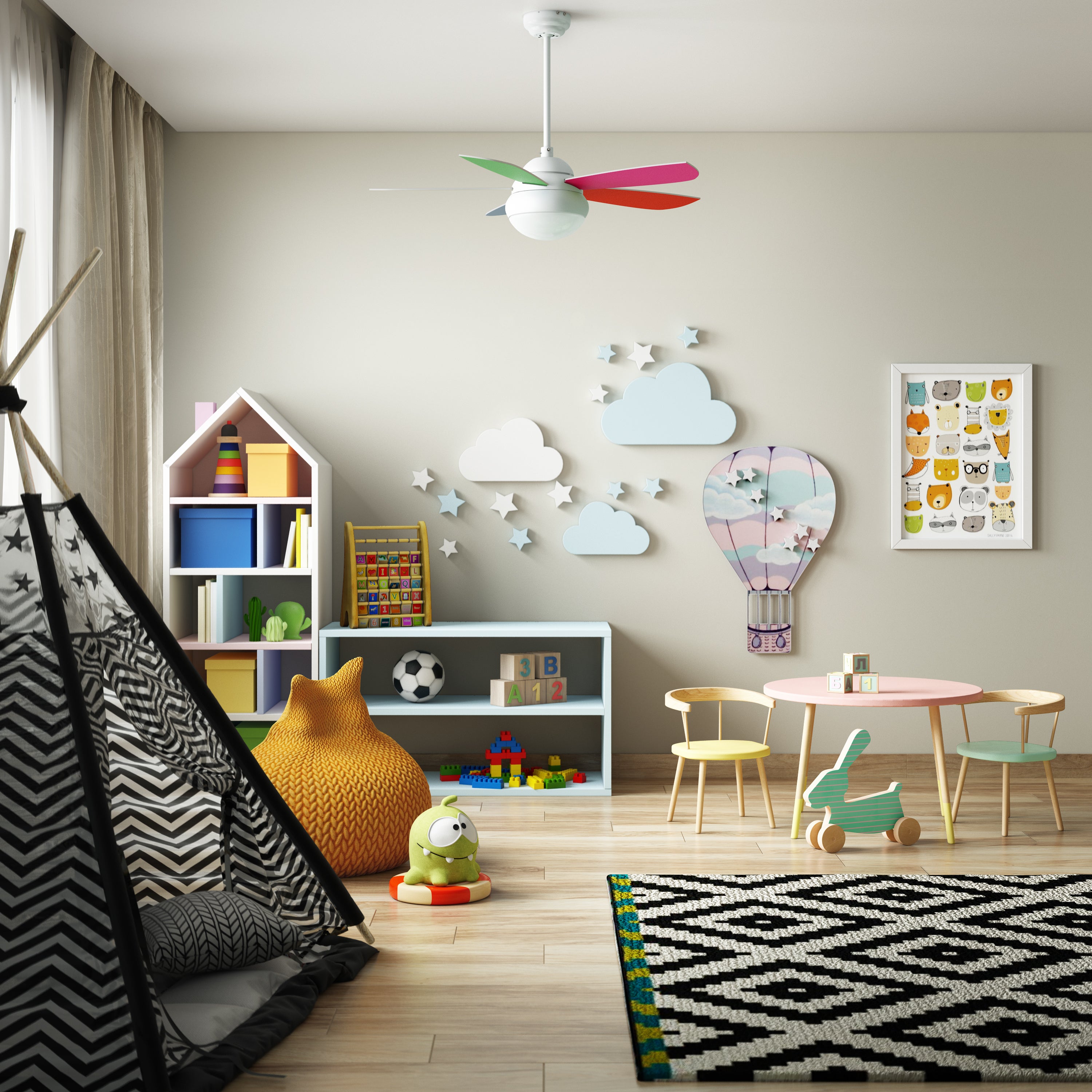 Ventilatore con 3 pale reversibili, diametro 106 cm, 2 lampadine non inclusa attacco E27. Ideale per ventilare un ambiente fino a 40 m². Grazie alle pale reversibili puoi distribuire meglio l'aria calda in inverno. Telecomando incluso. Regolabile, a 3 step di velocità